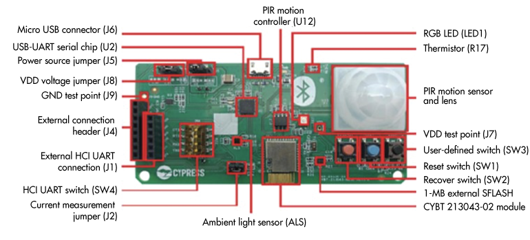 4顯示了可用于產(chǎn)品原型設(shè)計(jì)和開發(fā)的評(píng)估板示例。請(qǐng)注意,其中包括了智能照明應(yīng)用中通常需要的三個(gè)功能:用于照明設(shè)備的LED,開關(guān)以及用于占用傳感器的PIR運(yùn)動(dòng)檢測器。電路板底部邊緣中心的模塊包含BLE Mesh網(wǎng)絡(luò)以及運(yùn)行應(yīng)用程序軟件所需的CPU,內(nèi)存和天線。