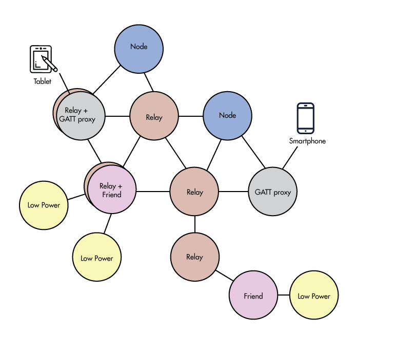 可擴(kuò)展拓?fù)涫?/span>BLE Mesh網(wǎng)絡(luò)理論上最多支持32,767個(gè)節(jié)點(diǎn),這個(gè)數(shù)目對(duì)實(shí)際應(yīng)用沒有實(shí)際限制。該標(biāo)準(zhǔn)定義了四種類型的節(jié)點(diǎn),并且可以將任何單個(gè)節(jié)點(diǎn)配置為支持多種類型: