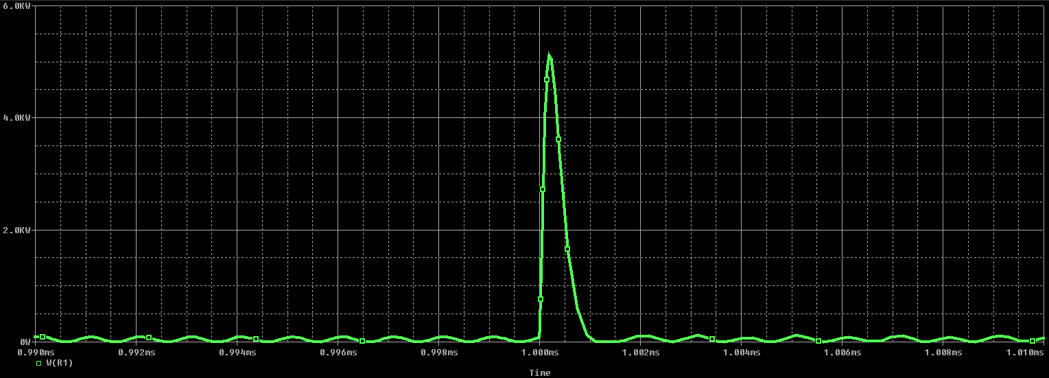 為了進一步分析,可以在參數(shù)掃描中掃描 ESD事件的幅度,以顯示瞬態(tài)響應在負載下如何變化。還可以將負載中的功率與其額定功率進行比較,以確定這種事件是否會導致負載故障。如下圖所示。由于SPICE仿真可以計算每個節(jié)點的電壓和電流,因此可以輕松計算負載組件中的功率并將其放置在圖中。從該圖可以看出,負載中消耗的功率約為5 kW,足以破壞大多數(shù)組件。