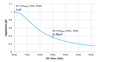 讓我們首先看一下直流偏置效應(yīng),它可能是有效電容的最有效降低器。例如,通過施加3 V直流電(額定電壓的47%),可以將1 μF,6.3 V額定值的X5R MLCC的有效電容減小至0.36 μF。請注意,用于直流偏置測量的標(biāo)準(zhǔn)信號條件是1 kHz500 mV RMS。這表明與1 μF標(biāo)稱電容相比降低了64(圖1